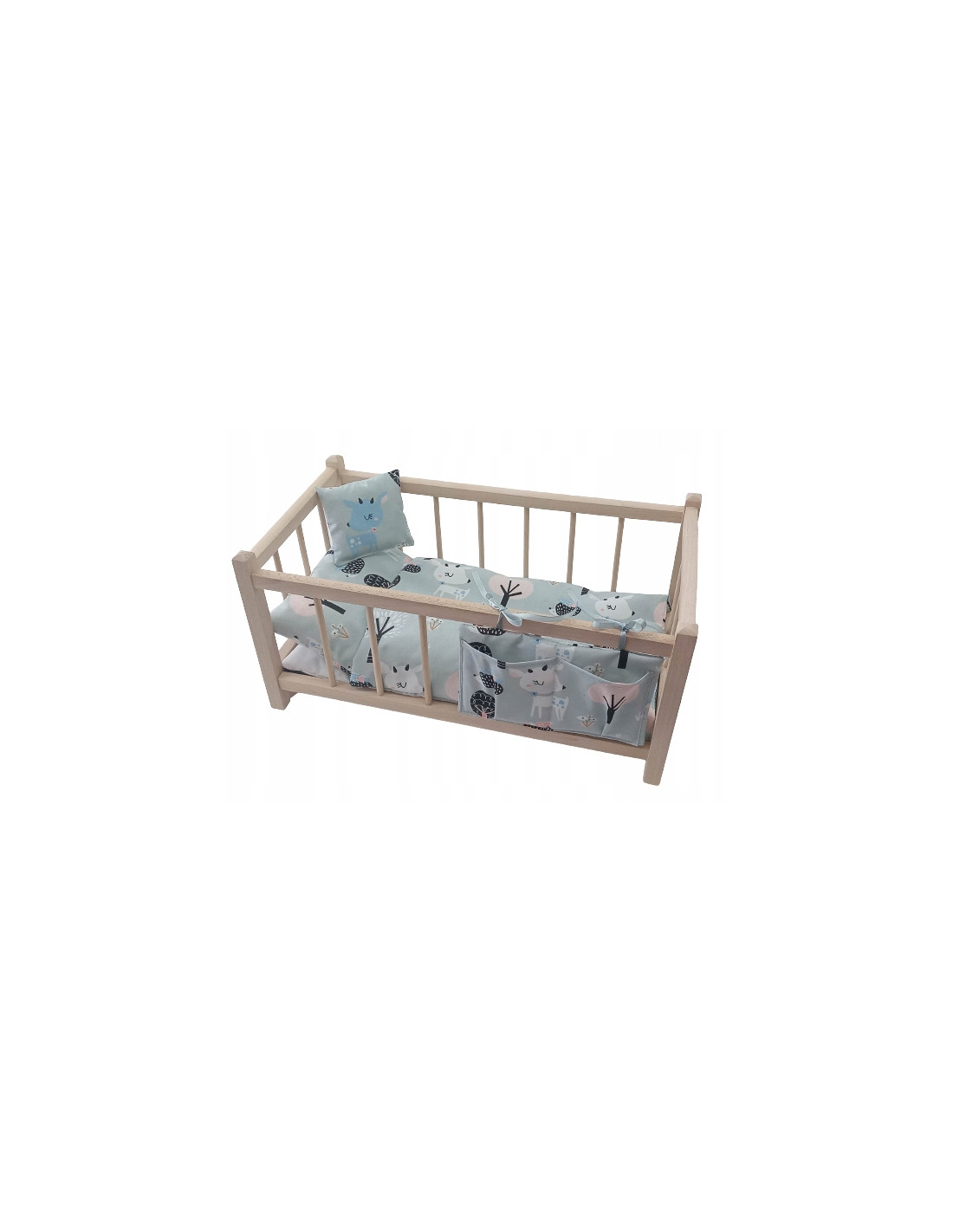 Łóżeczko wykonane z drewna bukowego,co zdecydowanie zwiększa trwałość i zapewnia wygląd zbliżony do ich dużego odpowiednika. W kołderkę wszyta owata puszysta i kolorowe ozdobne tasiemki.Organizer można wiązać na dowolny bok łóżeczka.Kolorowe tasiemki są wszywane losowo, pod kolor bawełny. Możliwość uszycia różnych wielkości na życzenie klienta. Drewniana konstrukcja jest nielakierowana, można ją pomalować według własnego uznania. Łóżeczko wysyłane jest w całości