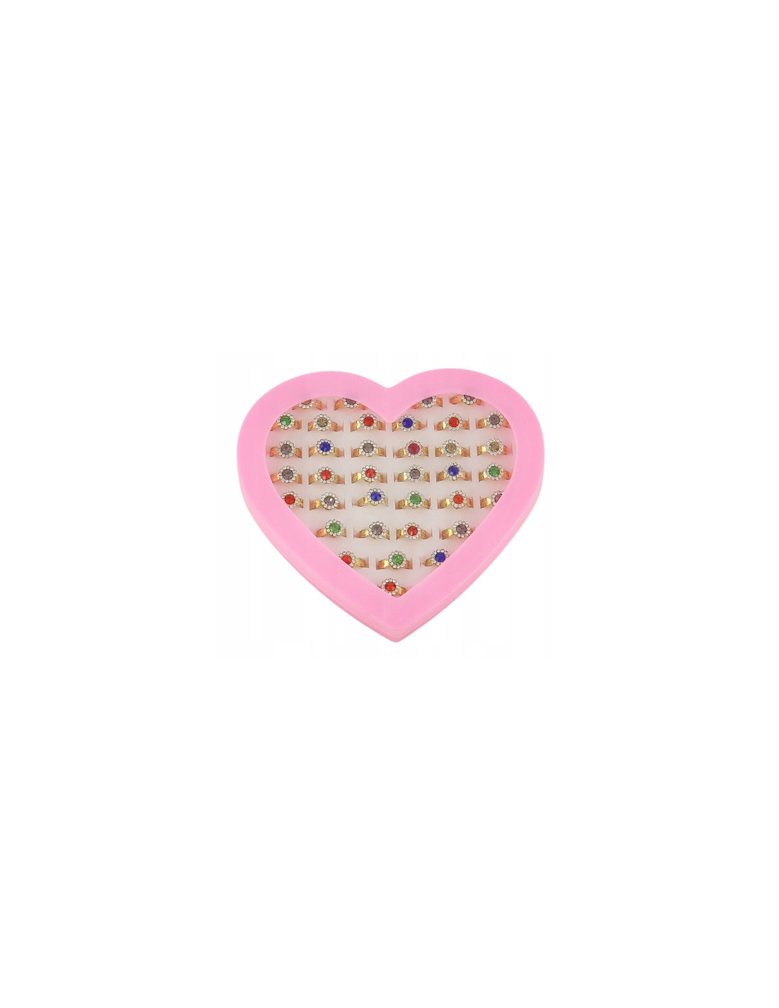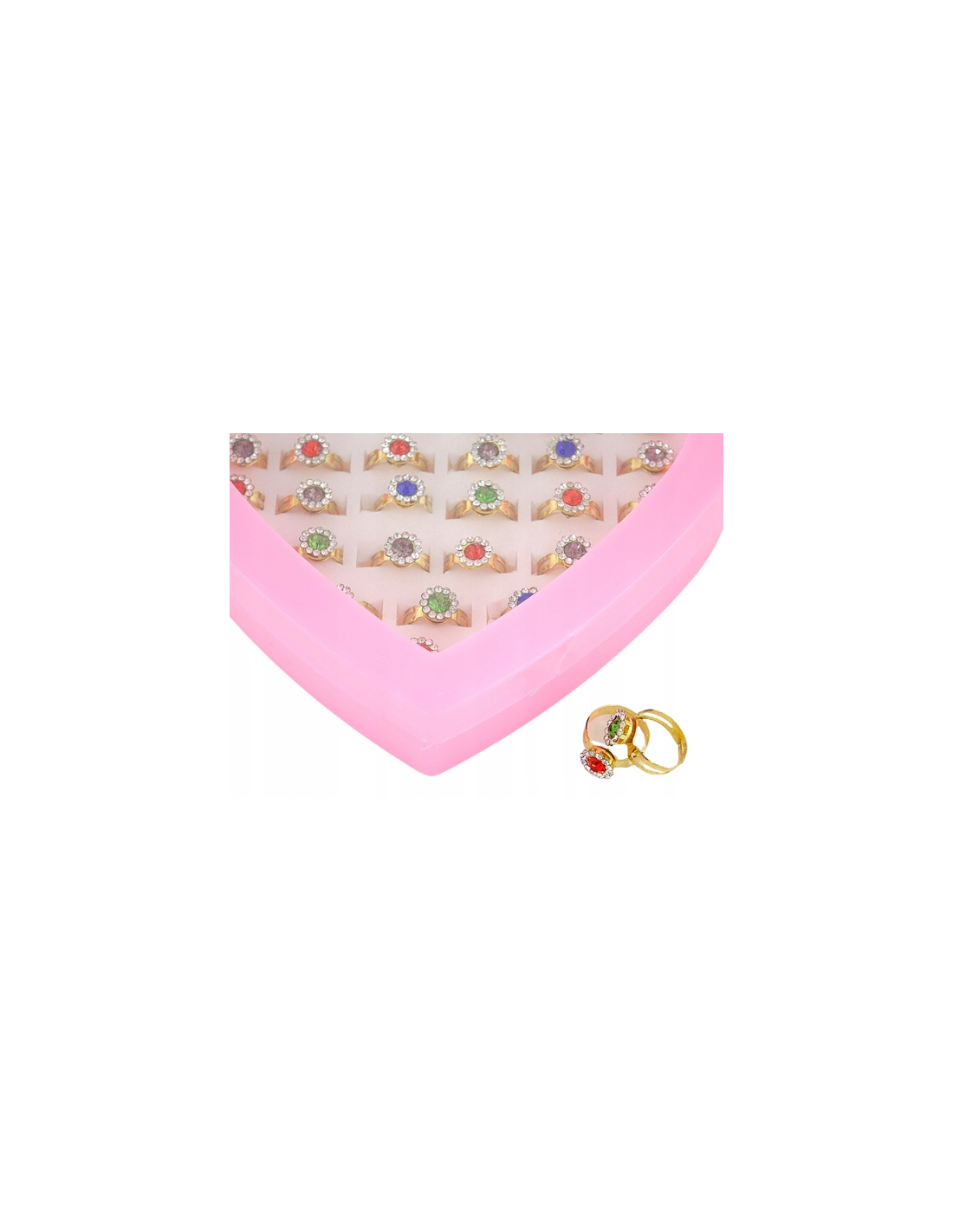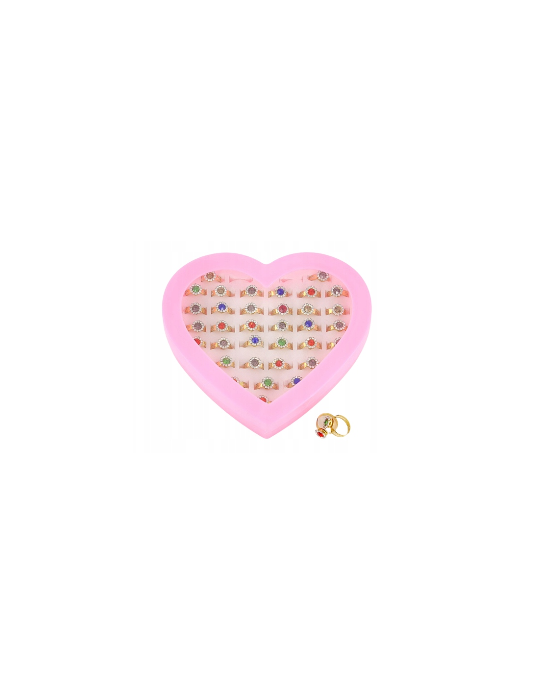 Każdy pierścień błyszczy się w różnorodnych kolorach i jest zapakowany w eleganckie plastikowe etui w kształcie serca, które jest nie tylko praktyczne, ale także dodaje uroku prezentowi.